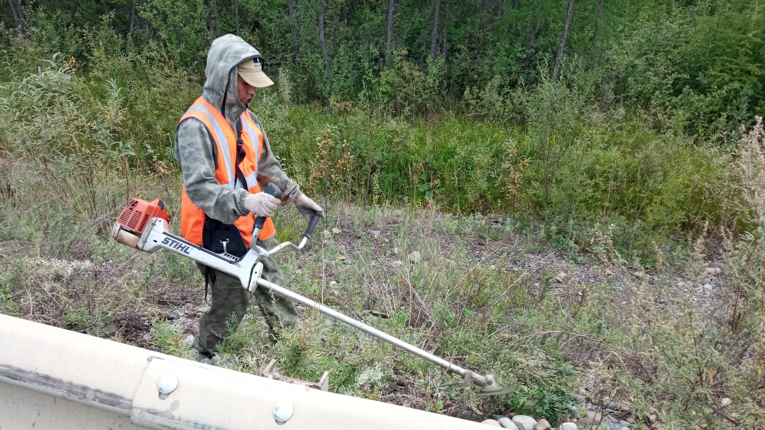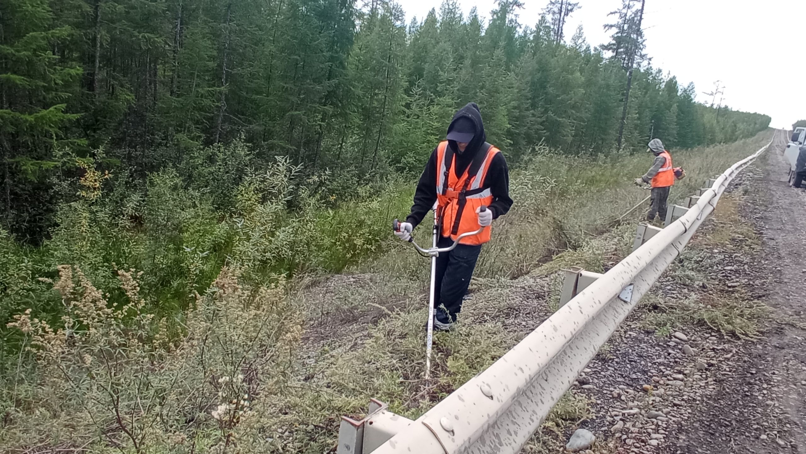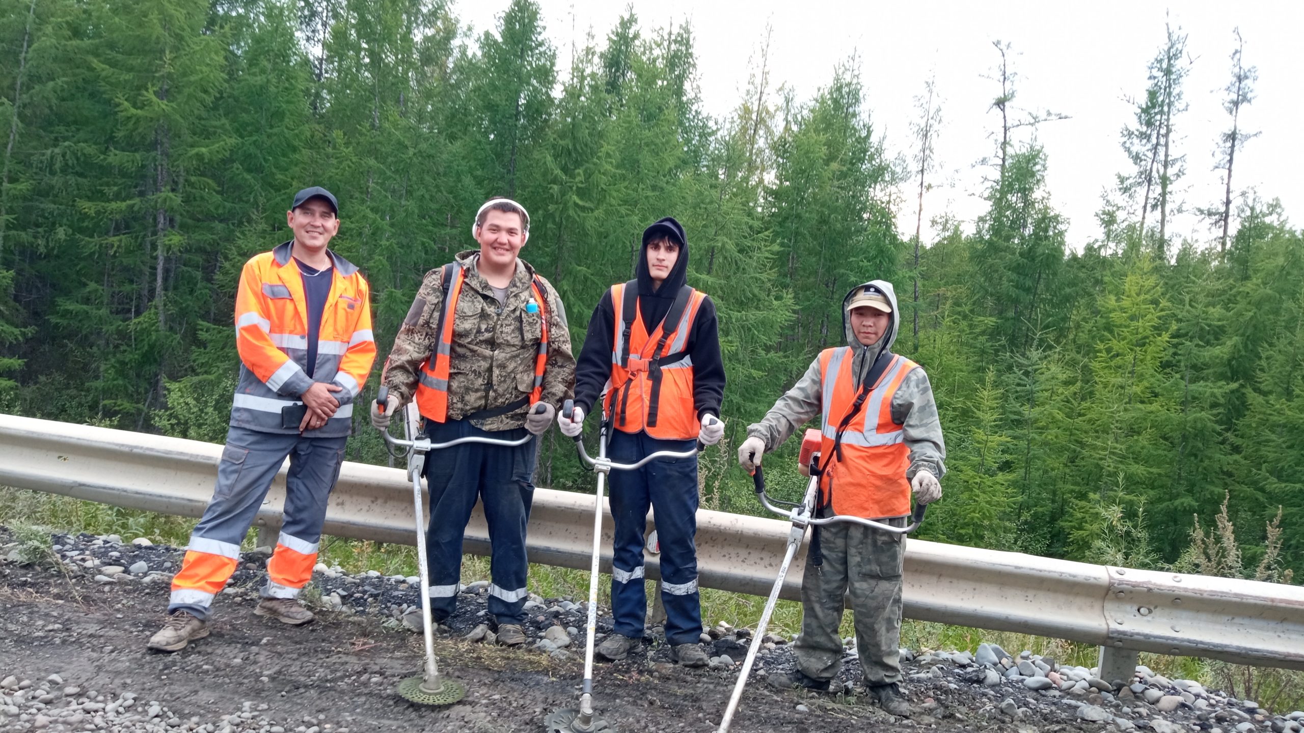 Проехав дальше, встретили рабочих, которые косили траву. То есть, когда дорога официально не работает, о ней все равно заботятся. Несколько ребят с бензокосами, оказались студентами горно-геологического техникума, подрабатывают на каникулах. Володя Сташков, Саша Сюпов, Вася Охлопков.