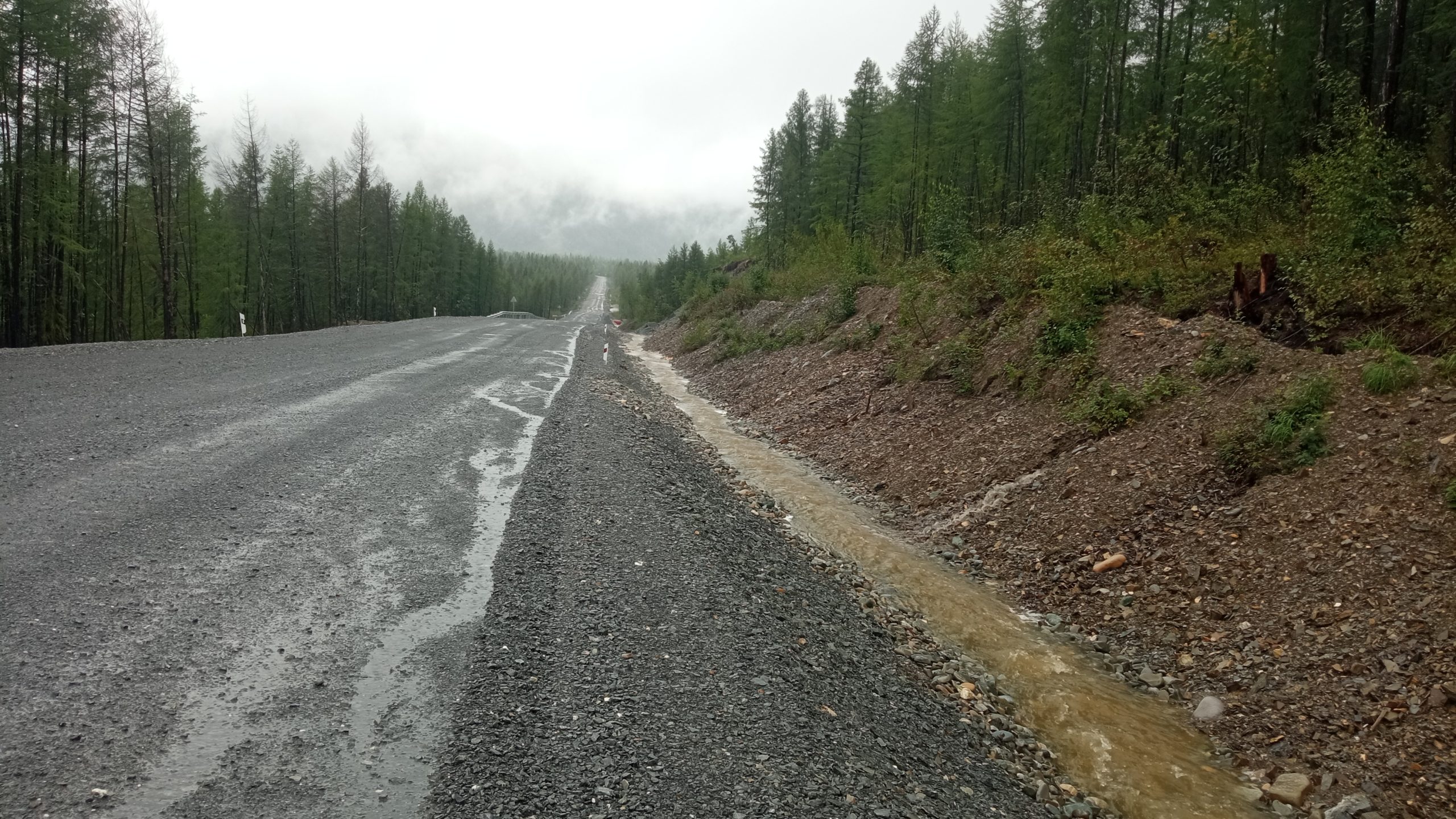 Гравийное покрытие дороги, оказывается, это не чистый гравий и песок, но и обязательно глинистые примазки. Такое покрытие при профилировании и при сухой погоде становится твердым, как асфальт. Но дождь размывает глину, и потом гравий начинает «выскакивать». Потому дорожники проводят профилирование проезжей части с досыпкой нового материала.