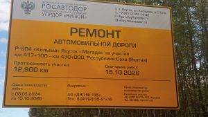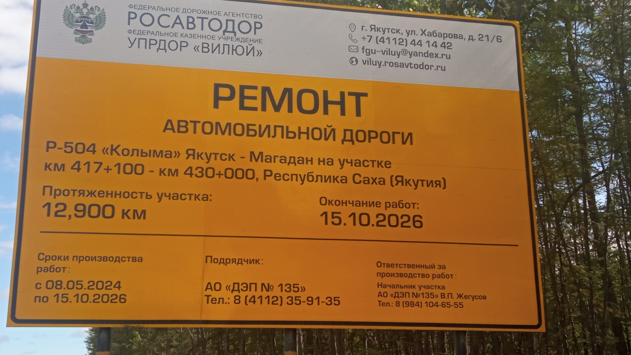 ДЭП №135 ведет ремонт ФАД «Колыма» на участке км 417 – 430. Делают дорожное основание, удлиняют и укрепляют пять водопропускных труб диаметром 1,5 метра, наносят разметку и устанавливают дорожные знаки.