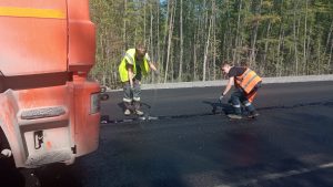 И вот теперь на этом тщательно подготовленном основании кладется уже второй слой асфальта. Перед тем, как поедет асфальтоукладчик, на отрезке дороги перед ним снуют ребята, приклеивают ленту — для сцепления асфальта. По одной стороне дороги верхний слой асфальта уже уложен, по другой кладут сейчас, и эта лента помогает их «склеить».