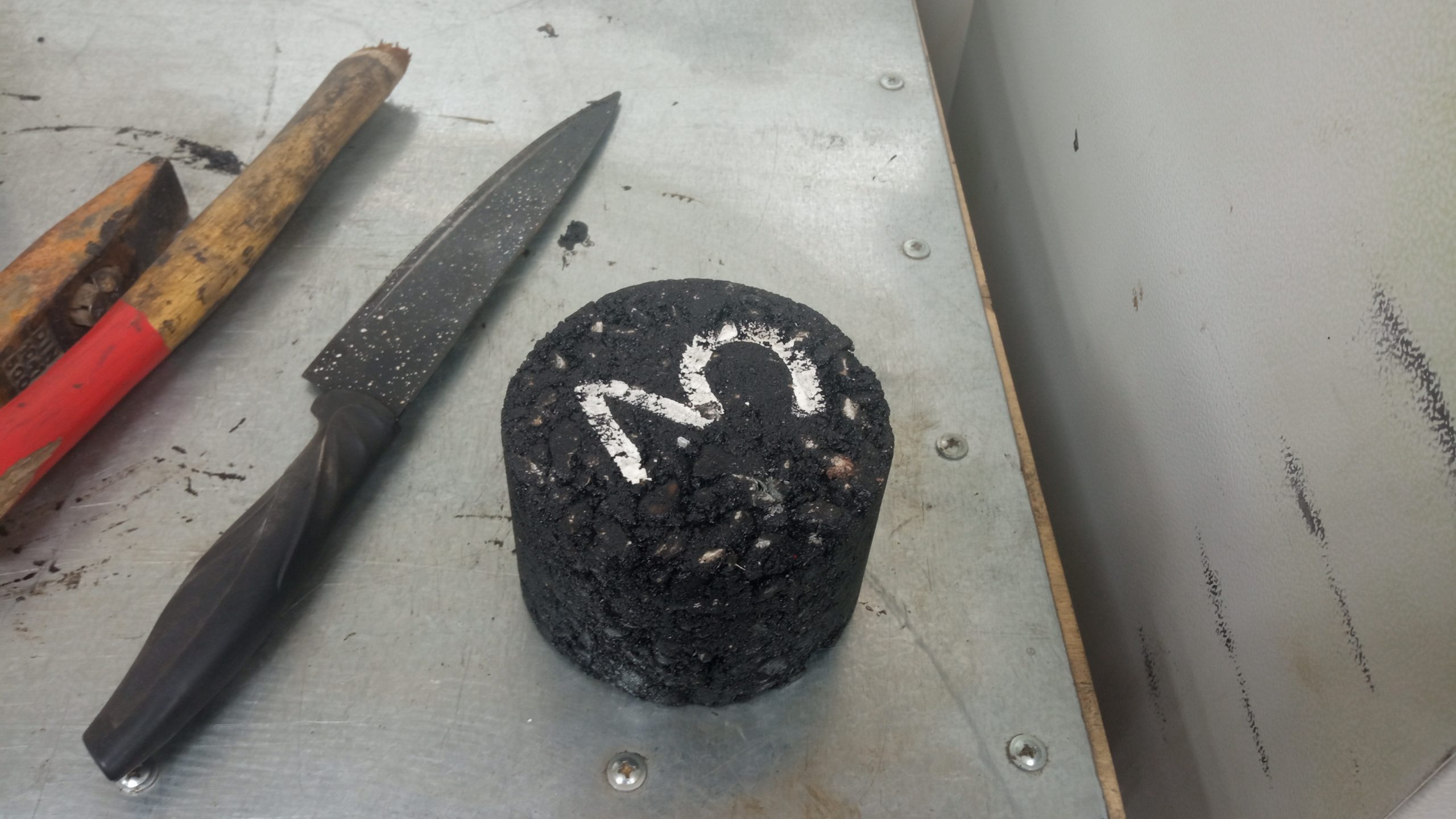 С его помощью из асфальта берутся керны, мы посмотрели их образцы – по-простому говоря, это такие столбики, вырезанные из уложенного асфальта.